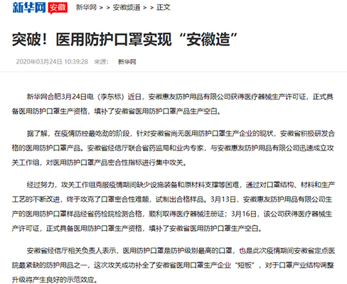 安徽惠友防护用品有限公司拿下安徽首张医用防护口罩生产许可证